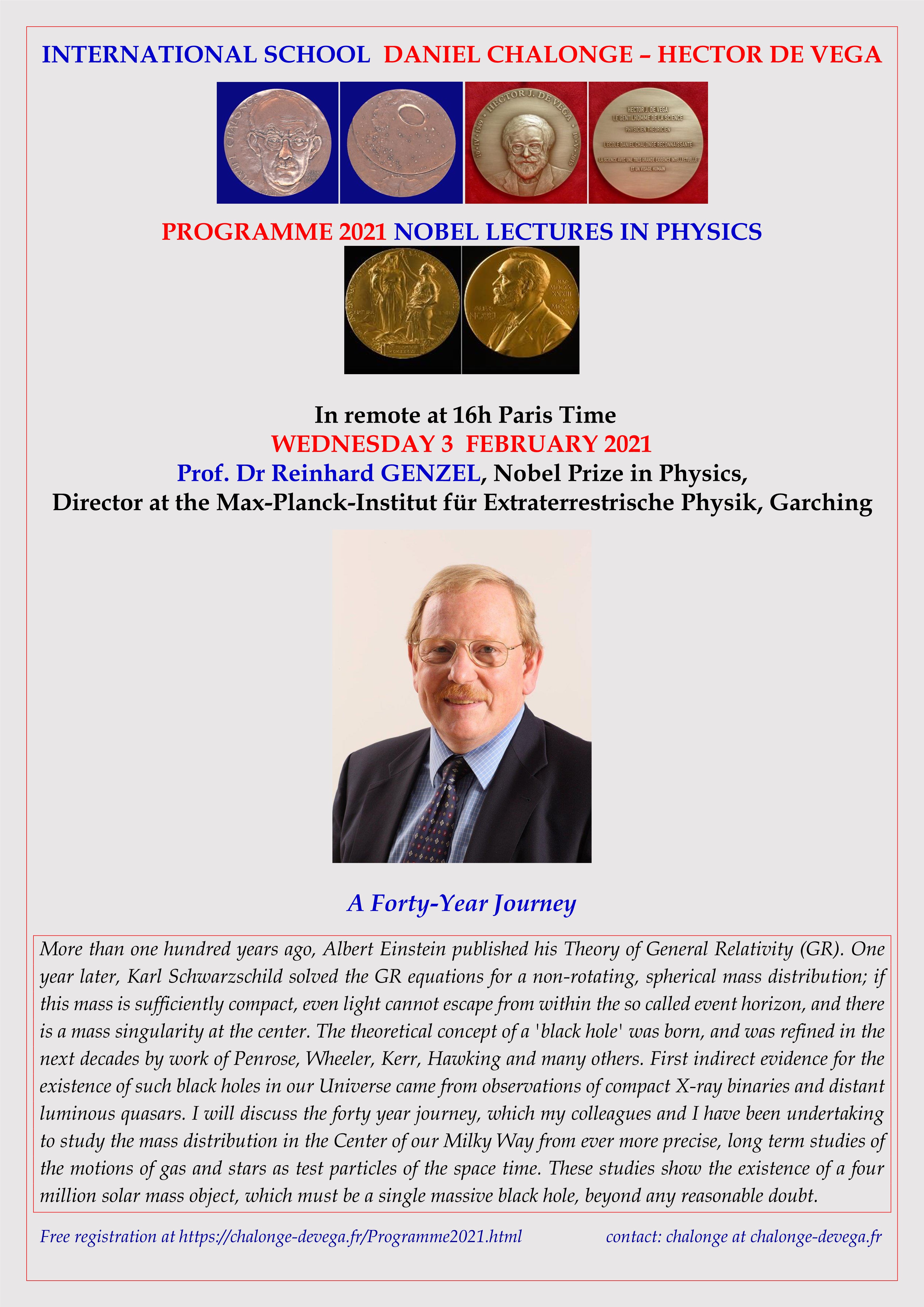 - Wednesday 3 February 2021: Prof. Dr Reinhard GENZEL, Nobel Prize in Physics,Director at the Max-Planck-Institut für Extraterrestrische Physik, Garching: