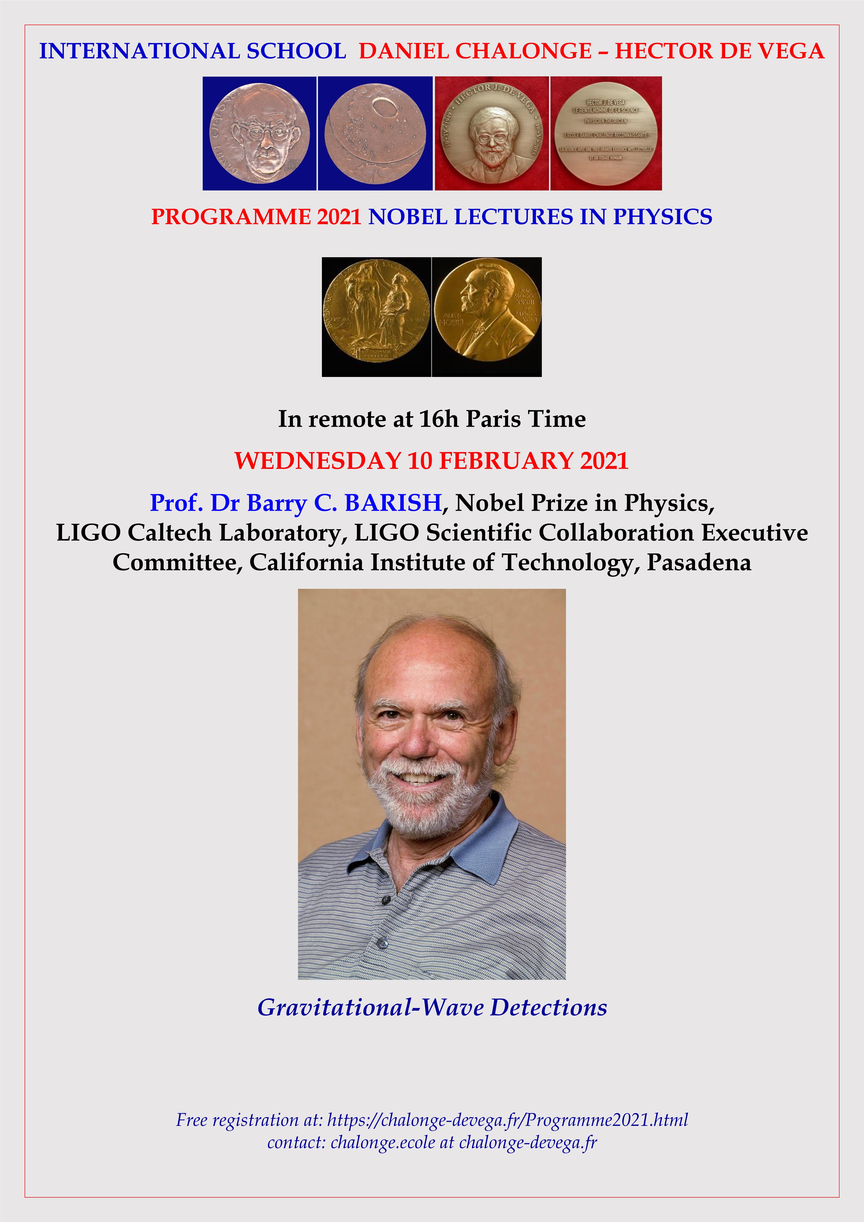 - Wednesday 10 February 2021: Prof. Dr Barry C. BARISH, Nobel Prize in Physics, LIGO Caltech Laboratory, LSCEC, California Institute of Technology, Pasadena and University of California Riverside: