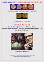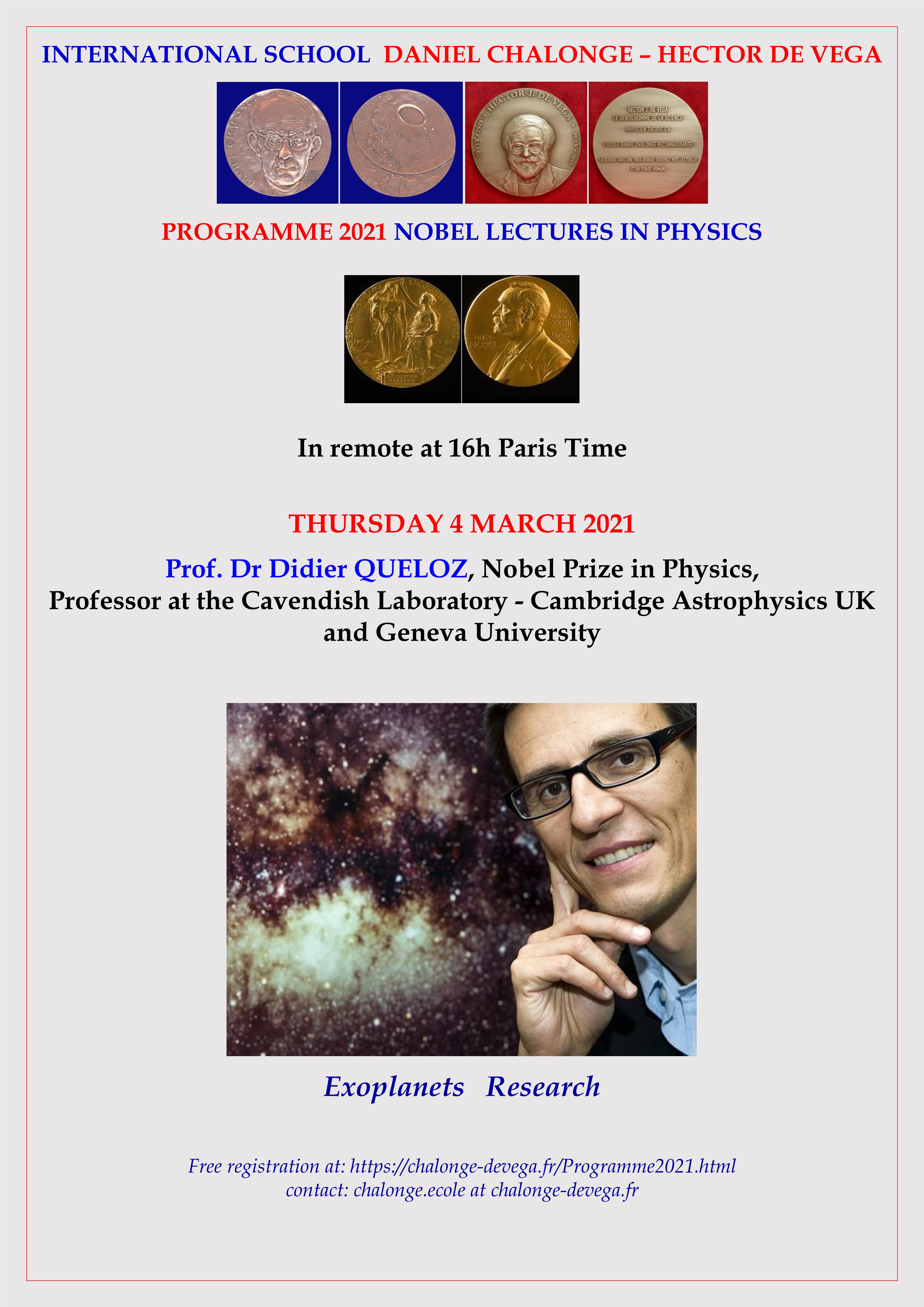 - Thursday 4 March 2021: Prof. Dr Didier QUELOZ, Nobel Prize in Physics, Professor at the Cavendish Laboratory-Astrophysics, Cambridge UK and Geneva University: