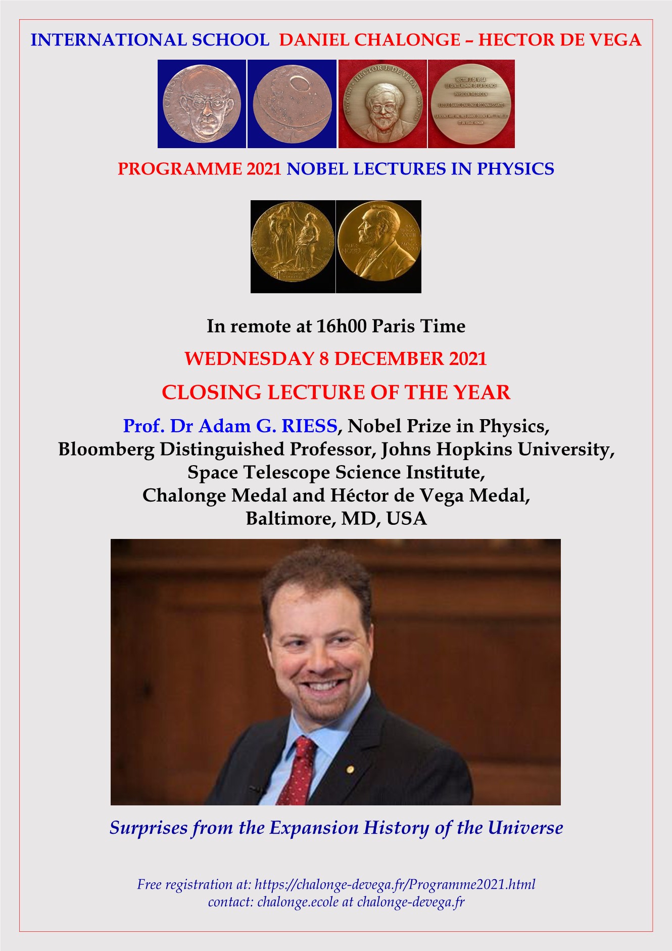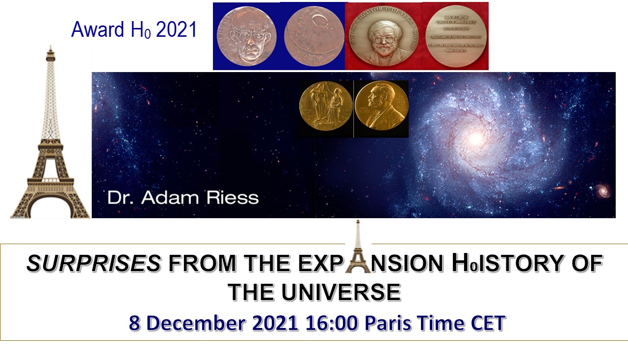 - Wednesday 8 December 2021 : Prof. Dr Adam G. RIESS, Nobel Prize in Physics, Bloomberg Distinguished Professor, Johns Hopkins University, Space Telescope Science Institute, Chalonge Medal and Hector de Vega Medal, Baltimore, MD, USA.