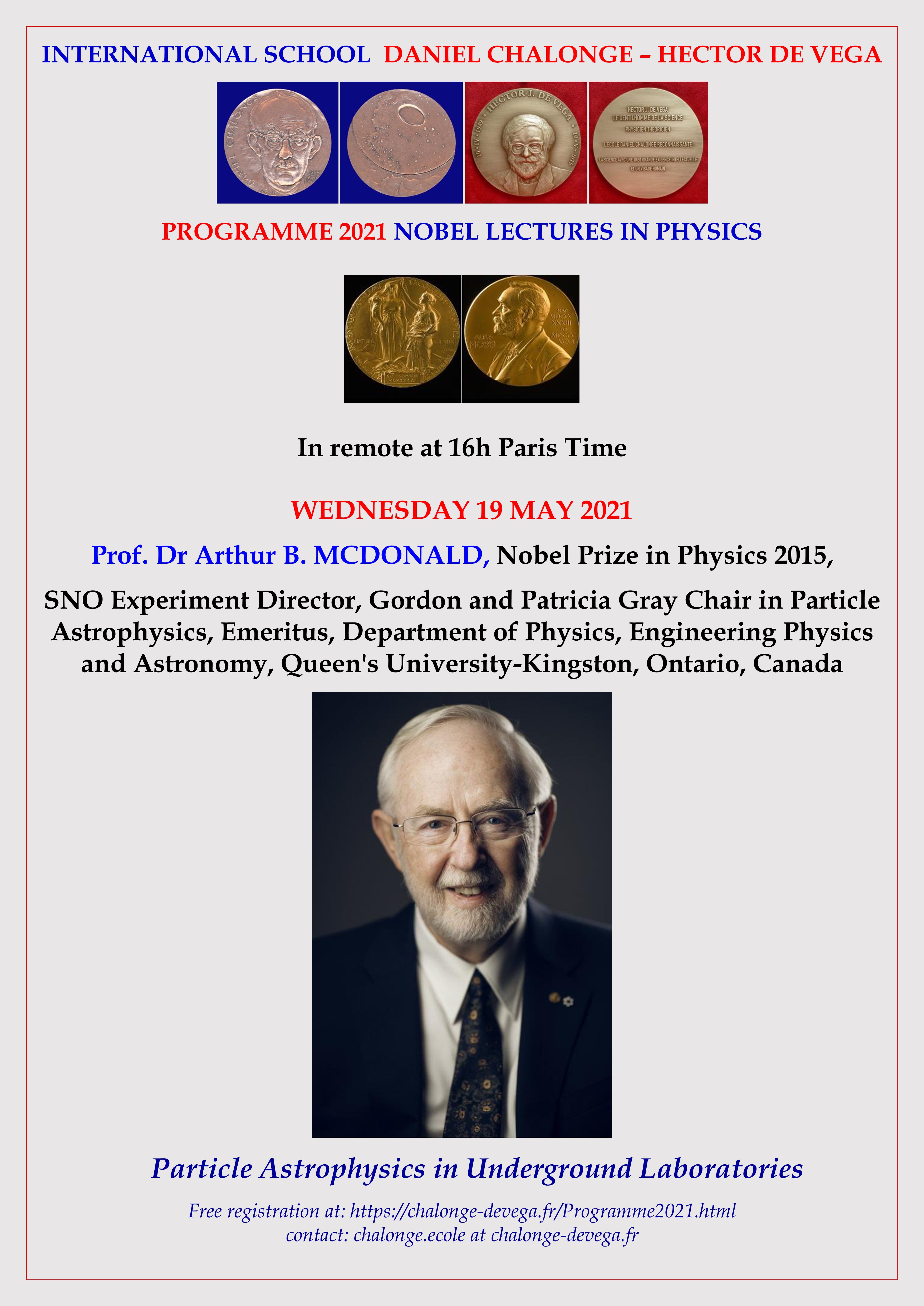 - Wednesday 19 May 2021: Prof. Dr Arthur B. MCDONALD, Nobel Prize in Physics 2015, SNO Director Experiment, Gordon and Patricia Gray Chair in Particle Astrophysics, Emeritus, Department of Physics, Engineering Physics and Astronomy, Queen's University Kingston, Ontario, Canada:
