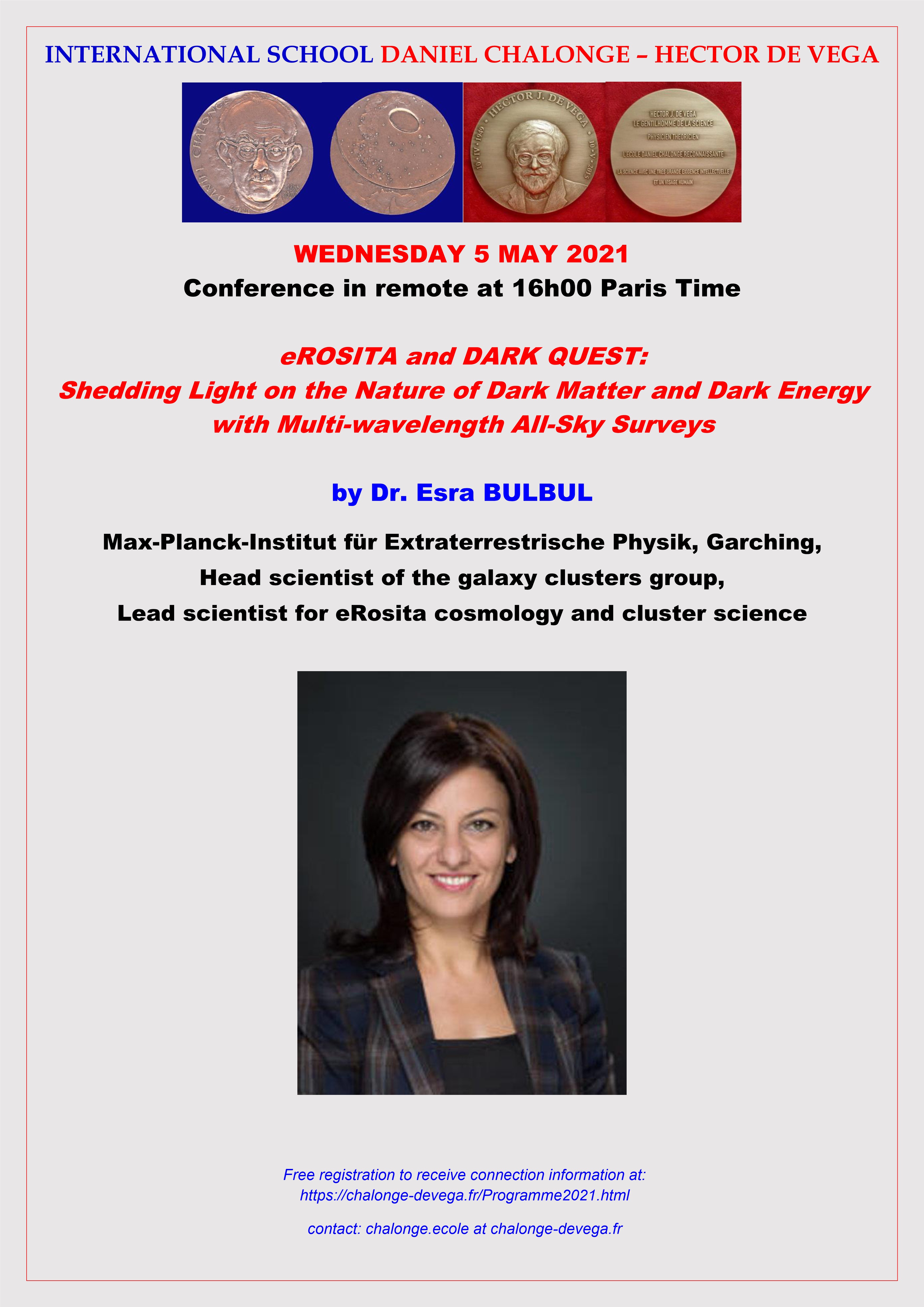 - Wednesday 5 May 2021: Dr Esra BULBUL, Max-Planck-Institut für Extraterrestrische Physik, Garching, Head scientist of the galaxy clusters group, lead scientist for eRosita cosmology and cluster science.
