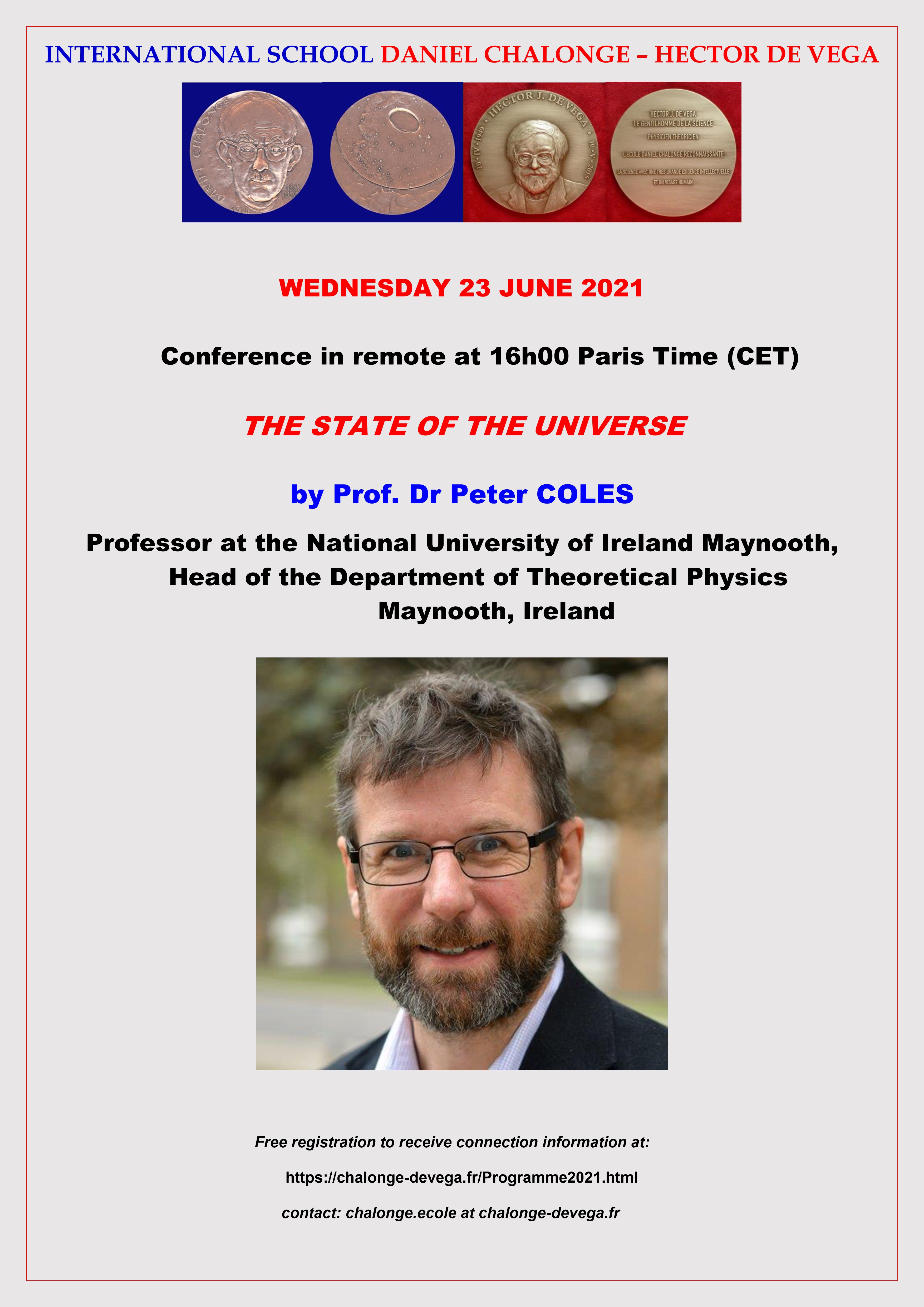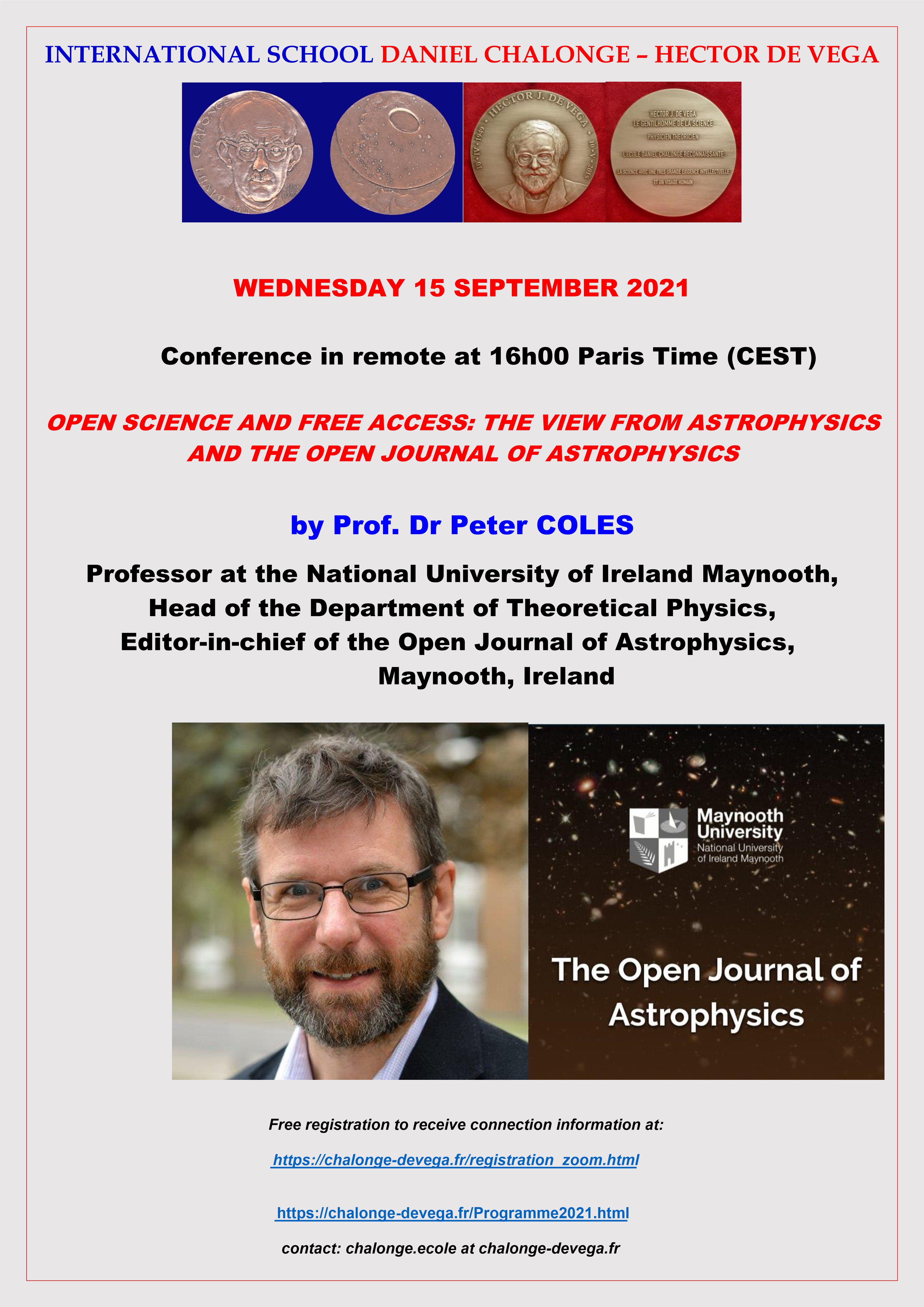 - Wednesday 15 September 2021: Prof Dr Peter COLES, Professor at the National University of Ireland, Head of the Department of Theoretical Physics, Editor-in-Chief of The Open Journal of Astrophysics, Maynooth, Ireland: