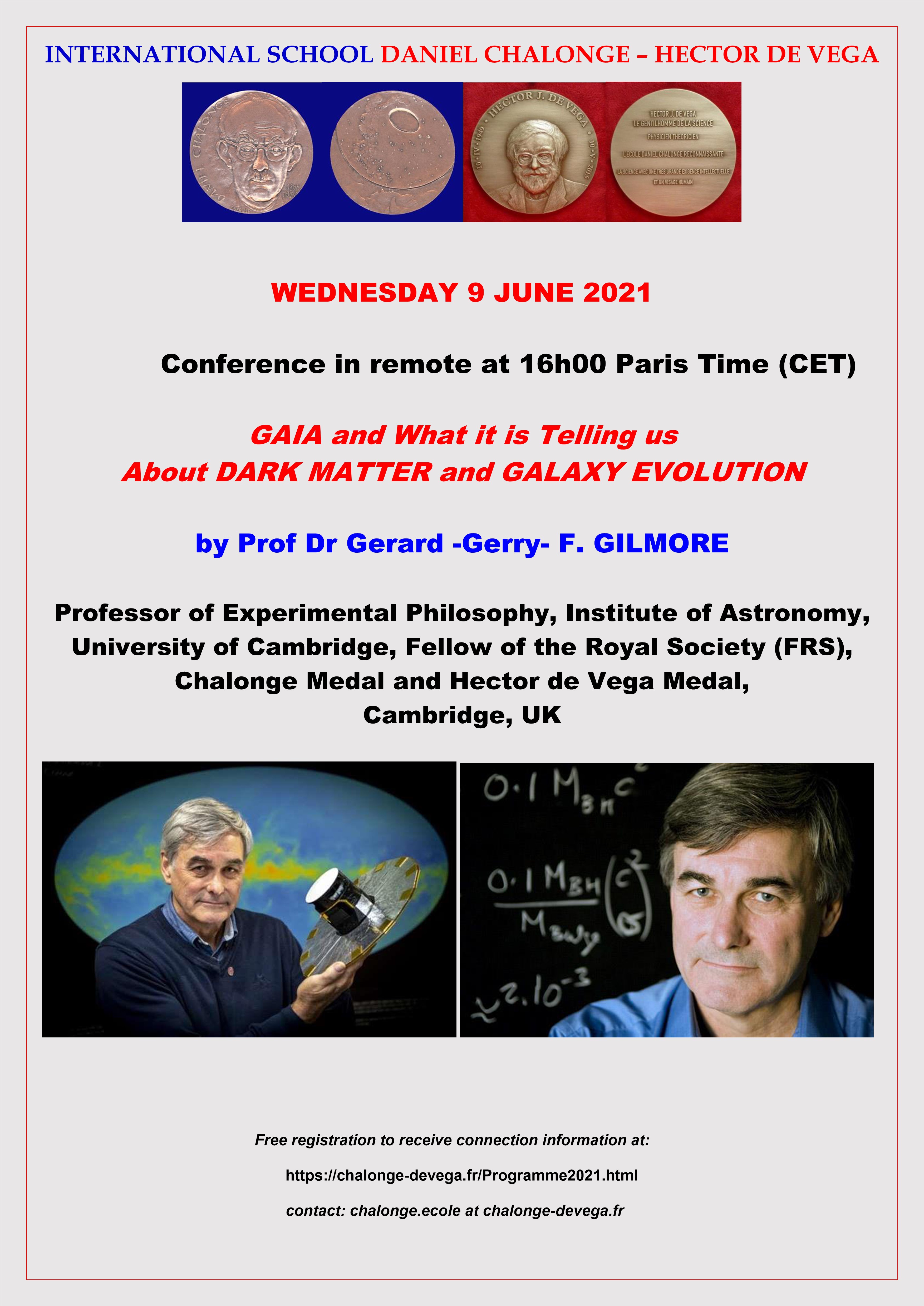 - Wednesday 9 June 2021 : Prof Dr Gerard -Gerry- F. GILMORE, Professor of Experimental Philosophy, Institute of Astronomy -University of Cambridge, Fellow of the Royal Society (FRS), Chalonge Medal and Hector de Vega Medal, Cambridge, UK: