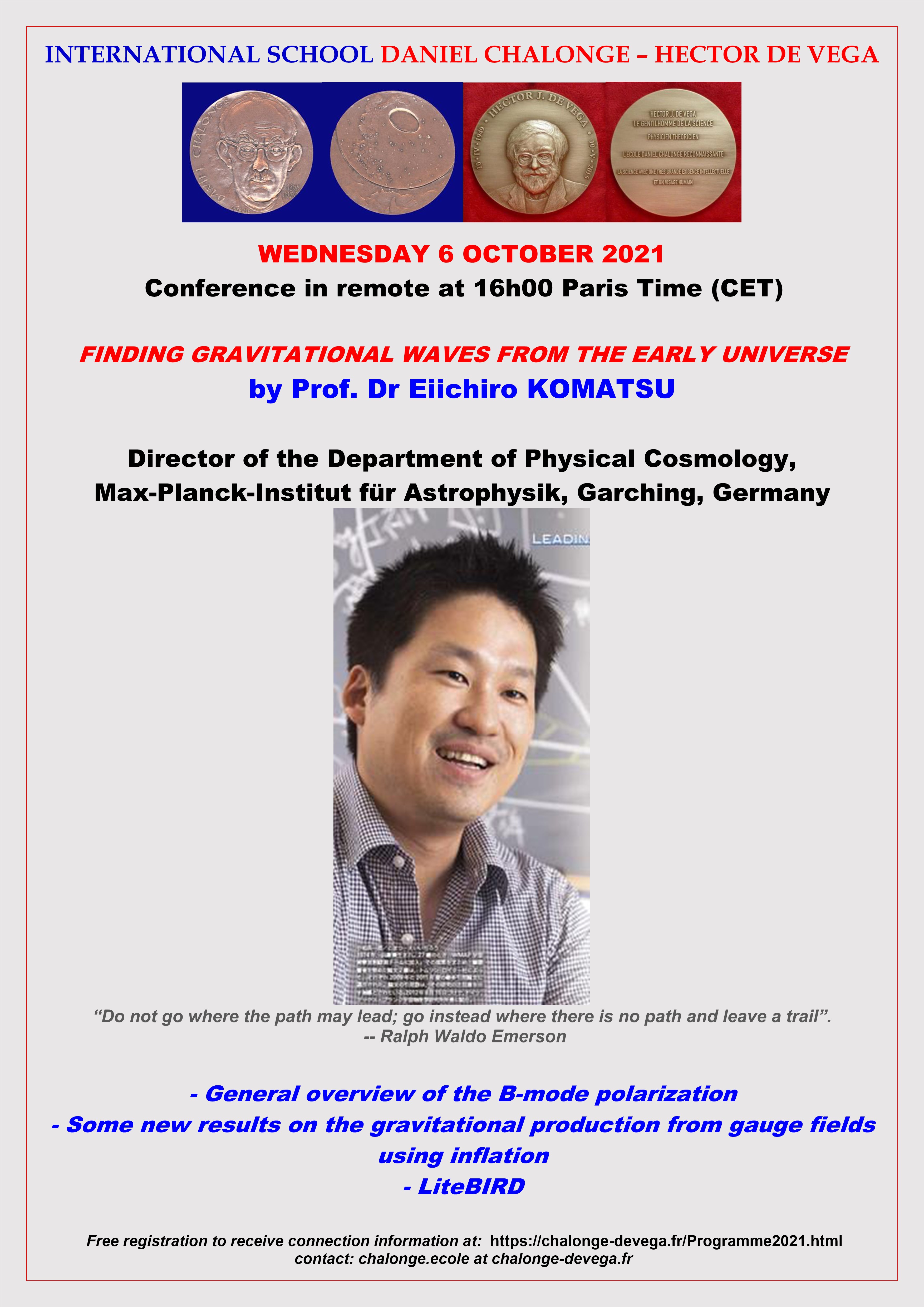- Wednesday 6 October 2021: Prof. Dr Eiichiro KOMATSU, Director of the Department of Physical Cosmology, Max-Planck-Institut fur Astrophysik, Garching, Germany: