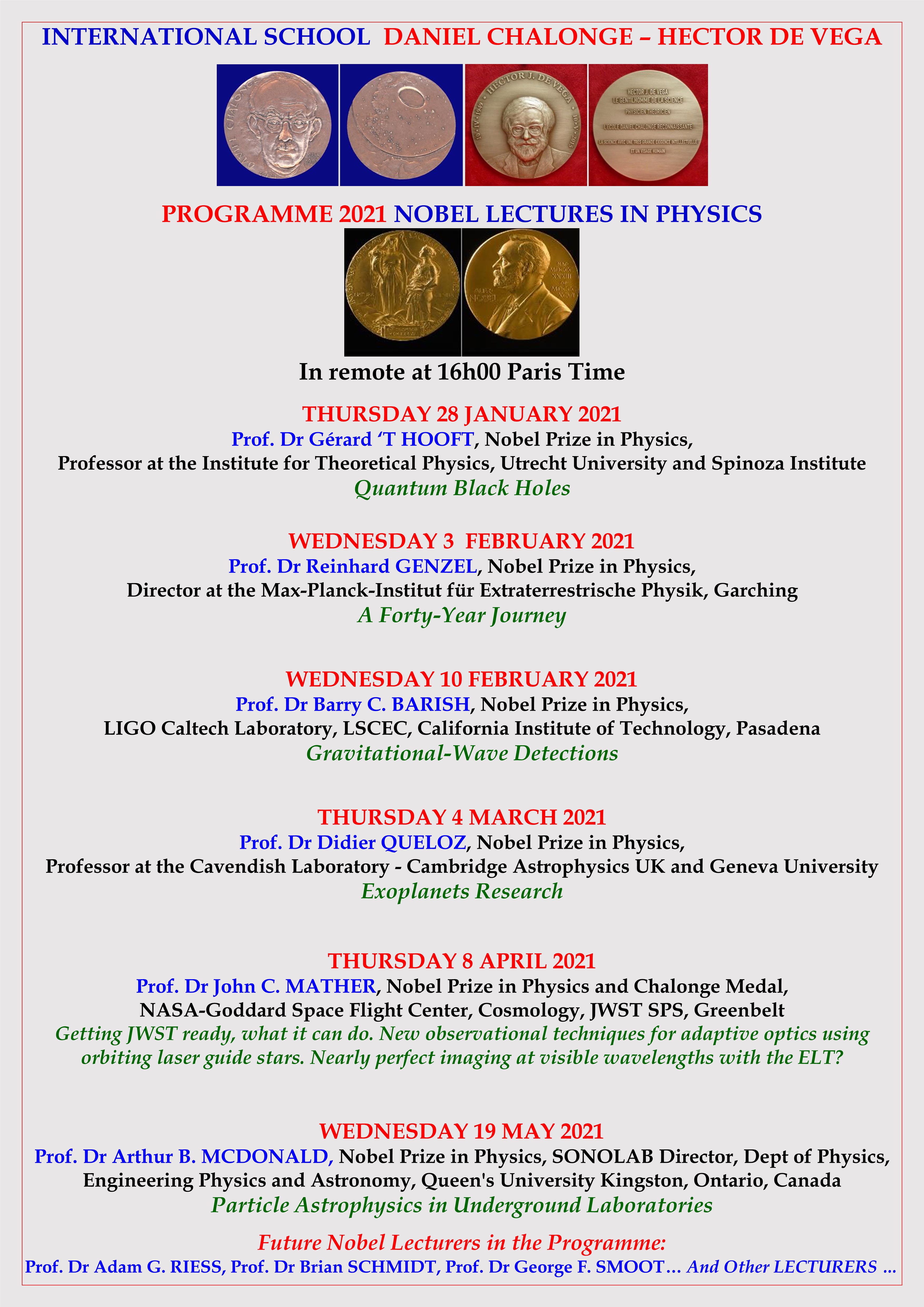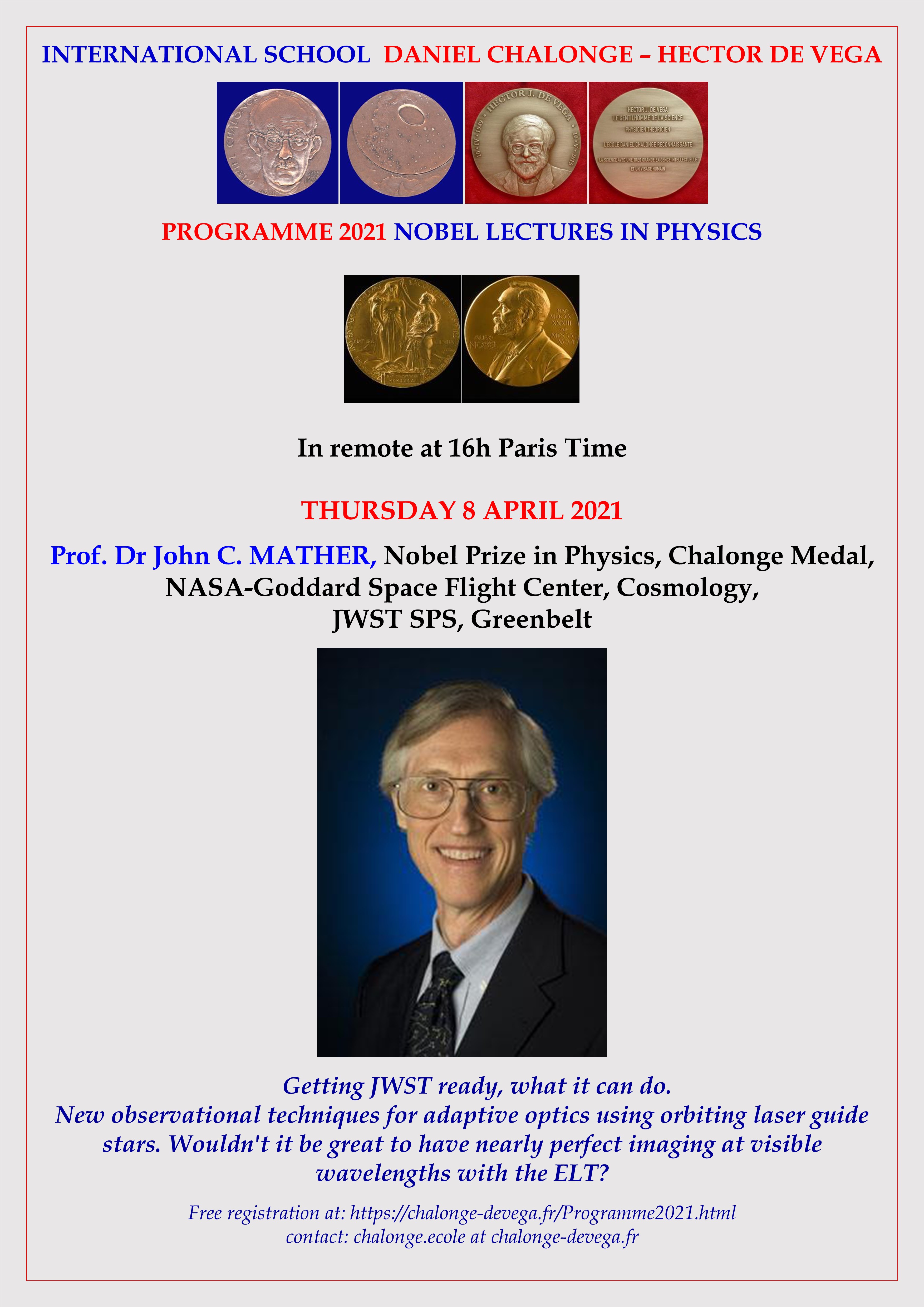 - Thursday 8 April 2021: Prof. Dr John C. MATHER, Nobel Prize in Physics and Chalonge Medal, NASA-Goddard Space Flight Center, Cosmology, JWST SPS, Greenbelt: