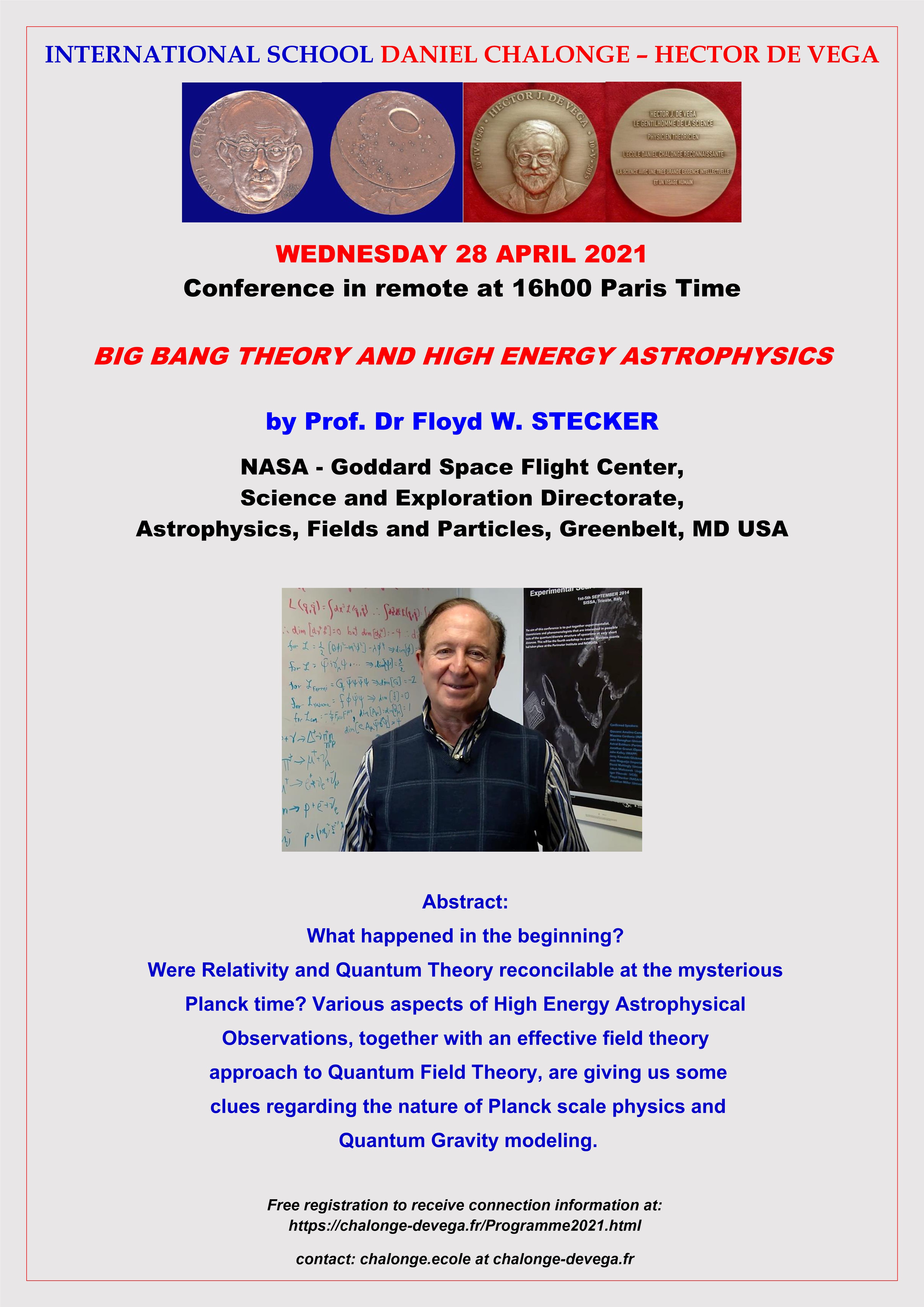 - Wednesday 28 April 2021: Prof. Dr Floyd W. STECKER, NASA - Goddard Space Flight Center, Science and Exploration Directorate, Astrophysics, Fields and Particles, Greenbelt: