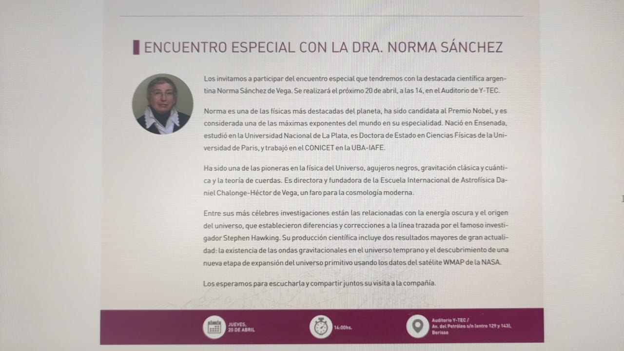 - 20 Avril 2023 : Conference Prof Dra Norma G. Sanchez a Y-TEC, YPF-Tecnologia-Conicet, Berisso :