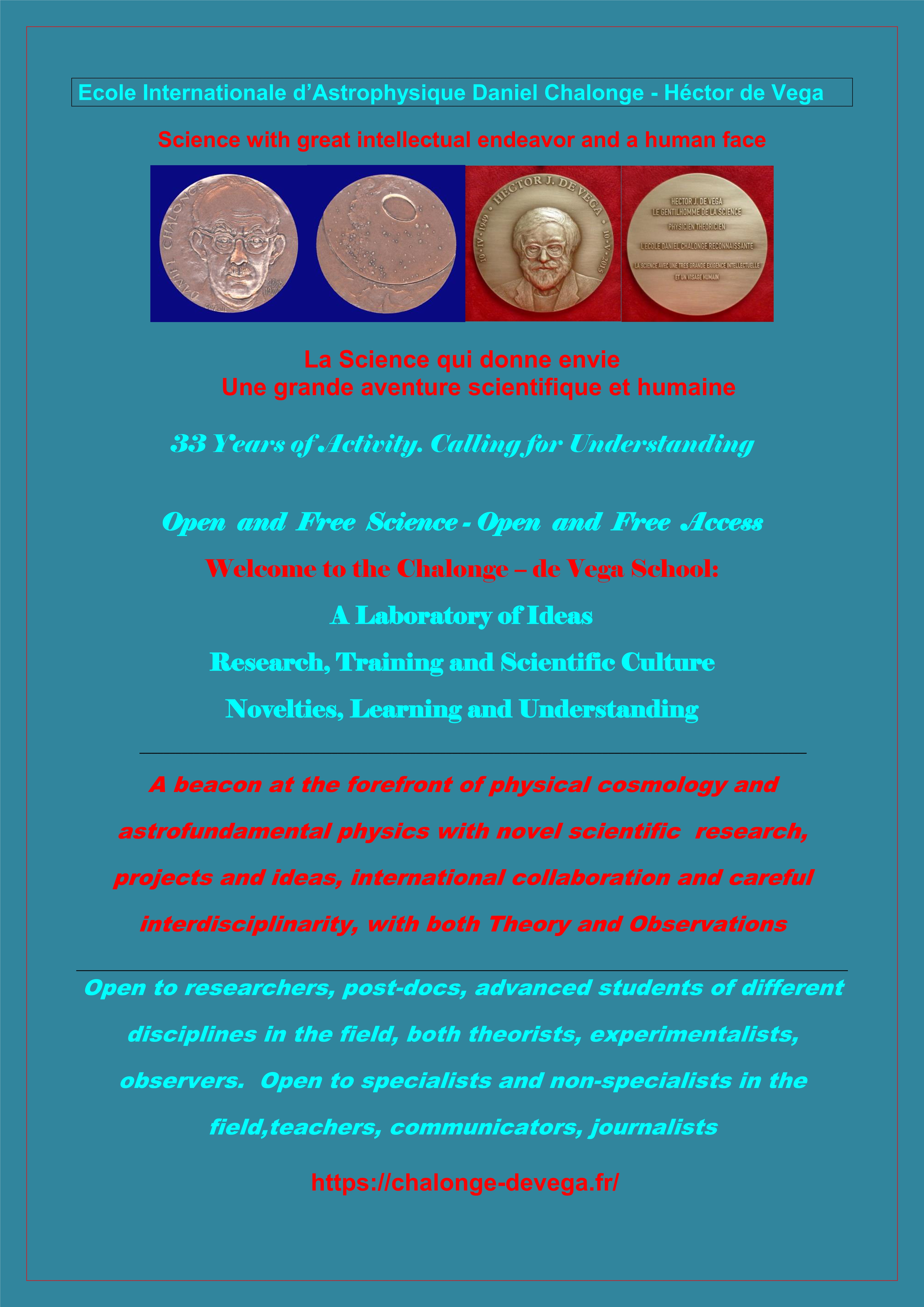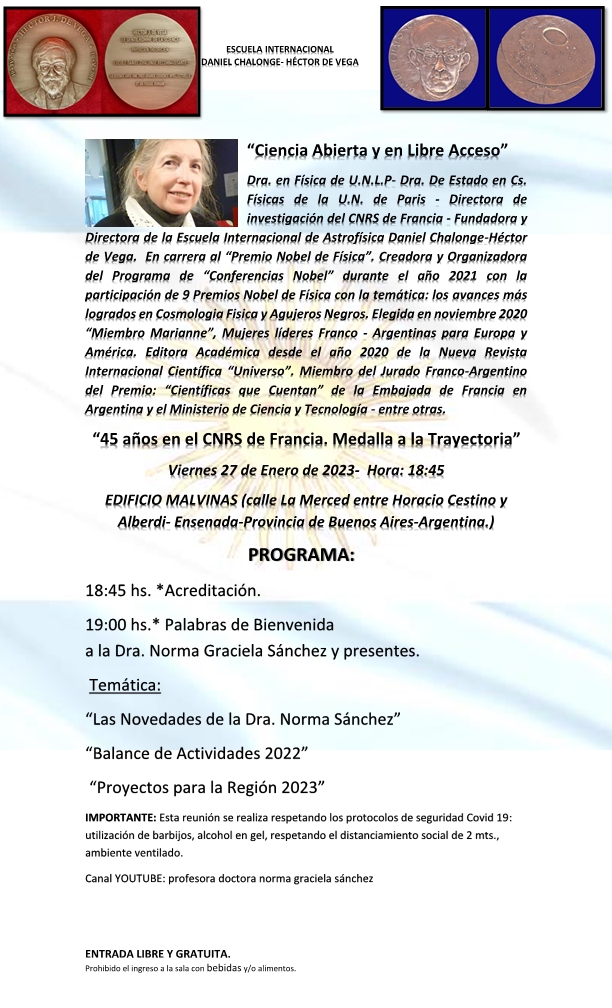 - Vendredi 7 Juillet 2023 14h30 : Séance Ouverte "DERNIERES NOUVELLES" de l'Ecole Chalonge - de Vega, Science Ouverte et en libre accés á la Cité Internationale Universitaire de Paris : Maison de l'Argentine, 27A Boulevard Jourdan, 75014 Paris: